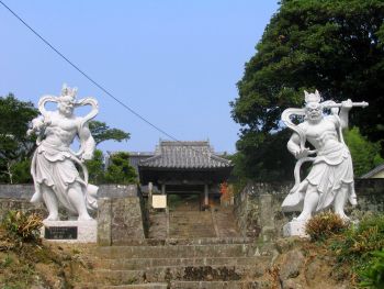 真木大堂(まきおうどう) 豊後高田市大字真中 国重文 「真木大堂の古えは、六郷満山六十五ケ寺のうち最大の寺院で本山本寺として栄えた。 馬城山伝乗寺といい、奈良時代養老年間に仁聞菩薩の開基で飛騨の匠が建立したと伝えられるが、仏像の作風からみて平安時代の建立で往時は広大な境内の中に七堂伽藍を備えて隆盛を誇った大寺院であった。 当初の伽藍は火災のために焼失し、江戸時代に再建された大堂のみが伝えられる、また現存する九体の仏像(国指定重要文化財)は藤原様式による優れた出来ばえを示し、古来多くの人々の信仰と守護のもとに今日に至っている。堂内には慈悲相に溢れた、本尊阿弥陀如来を中心に、日本一の大きさを誇る大威徳明王、不動明王が安置され、これに四天王と二童子が配置されている。平安時代を代表する九体の尊厳な仏像が一堂に安置されているのは素晴らしいことである。」 |