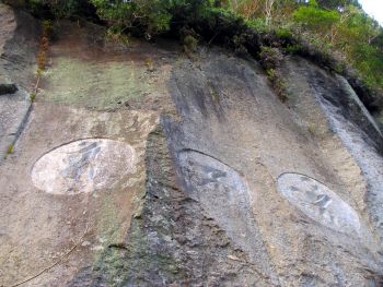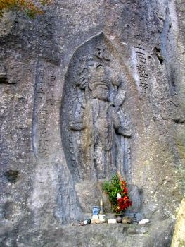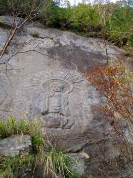 | 吉田知山の彫った磨崖仏 「清水磨崖仏群に最後の磨崖仏を彫刻したのが、吉田知山(1842〜1898)という旅のお坊さんで、「十一面観音像」「阿弥陀如来像」「宝筺印塔」の3つを、明治28年(1895)に彫刻しています。線で彫ったものが多い清水磨崖仏群の中で、知山が彫ったものは全て浮き彫りで彫られています。 この十一面観音は、奈良県長谷寺の本尊と同じ姿をしており、知山が長谷寺と関係があったことがわかります。川辺町内には長谷寺式の木製十一面観音増が、清水磨崖仏群と川辺町高田城の前の観音堂にありますが、全て知山の手によるものです。 ここの宝筺印塔と同じ形で木製のものも、当時知山が宿泊していた川辺町神殿の末吉家に残されています。 知山は、大阪の出身で、滋賀県延暦寺や長野県善光寺、京都府清水寺などで修行をし、川辺町にやって来ますが、いつ頃来たのかはっきりしません。ただ、明治24年(1891)に川辺町神殿の末吉家にいたことは、知山が彫った仏像を入れる箱の裏に書いてあることからわかっています。この末吉家には、今でも知山が作った仏像や木製の宝筺印塔、釈迦来迎図などの仏画、知山の位牌が残されています。 その後知山は、曽於郡大隅町に移り、大隅町月野にも磨崖仏群を彫刻しています。」 川辺町教育委員会 |