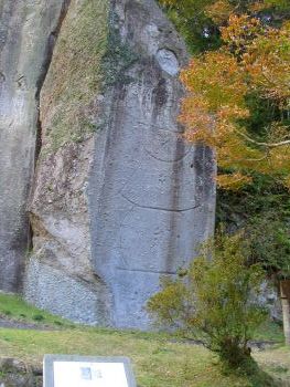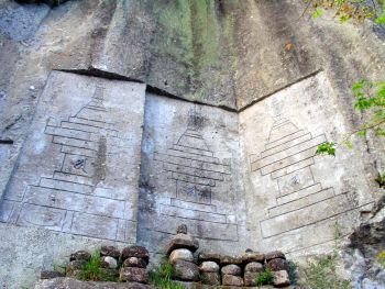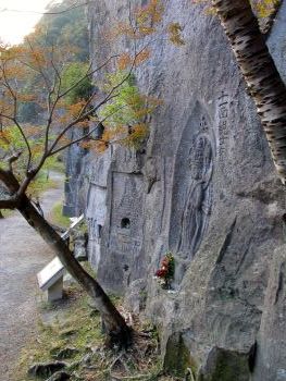 | 三大宝筺印塔 「これは宝筺印塔という塔で、もとは宝筺印というお経を収めていたものでしたが、鎌倉時代から亡くなった人の供養のために建てるようになりました。 この3つの宝筺印塔は、鎌倉時代後期の永仁4年(1296)3月13日に彫刻されました。清浄という女性が亡くなって49日目の供養のために、平重景という人によって掘られたものです。このことは、右と中央の塔の間に墨書きと彫刻で書かれています。この宝筺印塔の彫られた背景には、「輪廻転生」という考え方があるといわれています。 また、この清浄という女性を供養する別の宝筺印塔が、清水川下流側の入り口近くにも彫刻されています。それは死後35日目の供養のためのもので、平家幸という人が同じ年の2月28日に彫っています。 こんなに厚く供養された清浄という人は、当時川辺を治めていた河邊氏の領主の母親か妻ではないかと考えられています。 これらの宝筺印塔は、彫刻された時期や目的、彫刻した人が記録されており、詳しいことがわからない磨崖仏が多い中で、とても貴重なものです。 また、同じ人の供養のために、これほどたくさんの宝筺印塔が奉納されているのも、とてもめずらしいことです。」 川辺町教育委員会 |