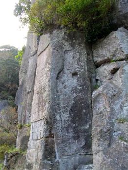 | 清水(きよみず)磨崖仏 「清水川ほとりの高さ約20mの崖に彫られています。現在200基が確認されており、線で彫った「線刻」が多いのが特徴です。 最初に磨崖仏が彫られたのは平安時代の終わり頃で、そのあと鎌倉、室町、明治の各時代にそrふぇぞれの想いを込めて彫られています。 その規模の大きさや仏教的価値の高いこと等から、昭和34年に鹿児島県の指定文化財に指定されています。」 川辺町教育委員会 |