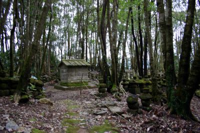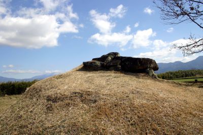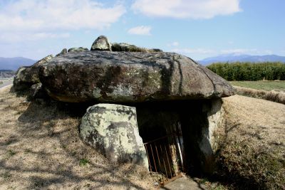 | 鬼の釜古墳 あさぎり町 熊本県指定史跡 「この古墳は古墳時代後期(6世紀後半)の円墳であるが、墳丘はかなり削り取られ、石室の一部が露出している。現況では直径約11m、高さ約4.5mである。 石室は巨石を用いた単室の横穴式石室で、才園古墳群2号墳の石室とならび、球磨地方の代表的な巨石墳である。 羨道部(古墳の玄室に通じる通路)は短く、羨門(羨道部と玄室の境にある門状の入口)は厚さ約80cmの巨石をくり抜いたもので、高度な石材加工技術がうかがわれる。玄室(遺体を安置する部屋)は幅1.9m、奥行き約2.4mである。 古くから開口しており、副葬品などは不明である。」 熊本県教育委員会 |