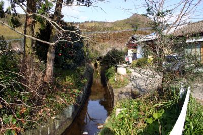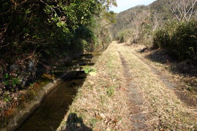 水路を1Kmほど上流へ歩いてたどりましたが、あとで話を聞きましたら直線距離で4Kmほど上流、田の原で取水しているそうです。 |