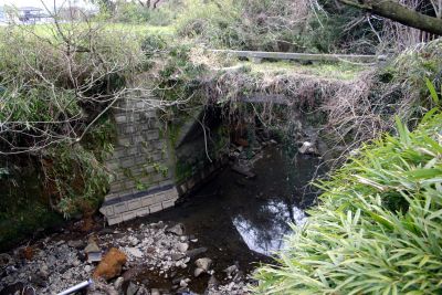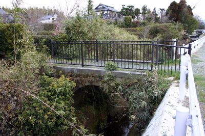 国道325号線高架下の西150mで県道30号線を200m北上、上井手沿いに左折、200m先に架かっています。 「瀬田上井手に架かる単一アーチ橋である。去る昭和12年、県道大津・植木線が開通し、従来の主要な生活道であったこの道路も利用者が減少したがその以前は交通の要衝であり、古閑原区の玄関口にあたっていたところである。元来、眼鏡橋は莫大な費用と、労力を要するため、最も重要な生活道にのみ架設されたものである。この眼鏡橋の基礎部は、井手底から約2.2m上方からはじまっており、変形アーチ橋であるが、幸い両岸が堅い岩盤のために、保存状態は良好であるが、一般的な見方としては、幕末から、明治初期の架橋と思われる。 橋長6.7m・橋幅2.2m・輪石数25枚・高さ4.9m・スパン4.9m・である。」 菊陽町教育委員会 |