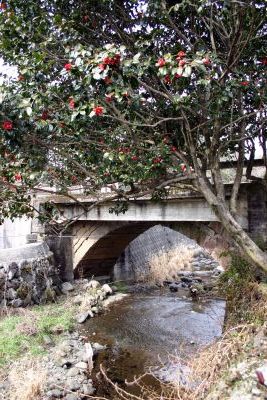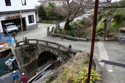 大願寺橋から150m南西に架かっています。下流側は拡幅されていますので、覗き込まないと輪石は見えません。 上流側には桁石3列×3の単径間方丈桁橋で拡幅してあります。 この単径間方丈桁橋と同じ型式は下流の西鶴橋、大分県香々地町の鵯越橋などがあります。 |