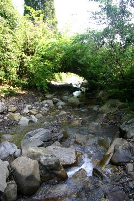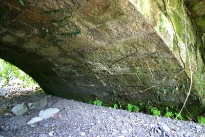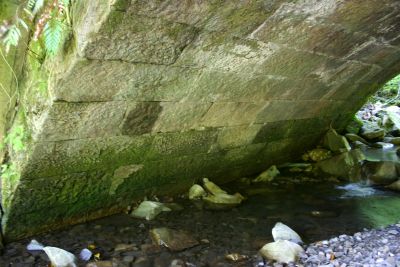 1,582 上白木俣(かみしらきまた)橋(仮称) 日南市酒谷甲 上白木俣 橋長:8.0m 橋幅:5.5m 径間:6.6m 拱矢:約2.6m 環厚:44cm 下流側はコンクリートで拡幅してあり、上から見ても輪石は見えません。 上流側も草木に覆われ、下に降りなければ石橋とは分かりません。 念のため下に降りて輪石が見えたときには驚きました。 上白木俣から 旧国道222号線へ分岐して1.3Km地点に架かっています。 |