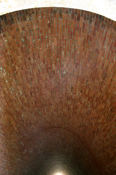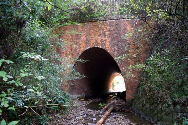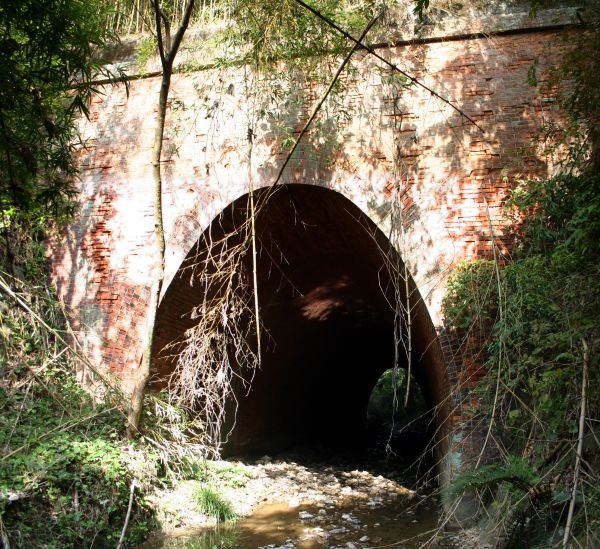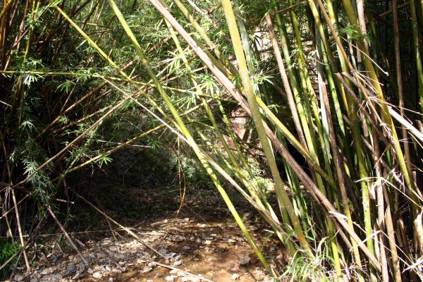 小川を遡ると、竹薮の向うにレンガ製の構造物が見えました。