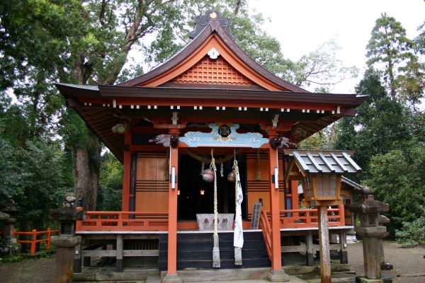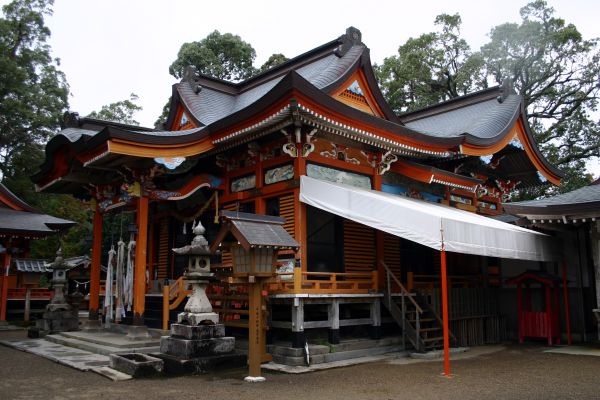 | 榎原神社本殿 県指定有形文化財 「本社は、当時神女として崇められていた内田万寿女の遺言によって、飫肥三代藩主伊東祐久公が、万治元年(1658)12月23日、鵜戸神宮より勧請されたものである。(摂社桜井神社は内田万寿女を祀る) 現在の社殿は宝永4年(1707)に建てられ、当初は八幡造りであったものが、寛政10年(1798)、当時流行していた権現造りに改造されたものと思われる。拝殿を入母屋屋根とし、正面に千鳥破風、その前面の向拝に、唐破風を設けた。拝殿・相の間・神殿をつなぐ平面は八幡造りのままであるが、正面の姿は、権現造りである。しかし、従来から関係者は、屋根の複雑さから、八ツ棟造りと呼びならわしている。県下には唯一の貴重な有形文化財である。」 南郷町教育委員会 |