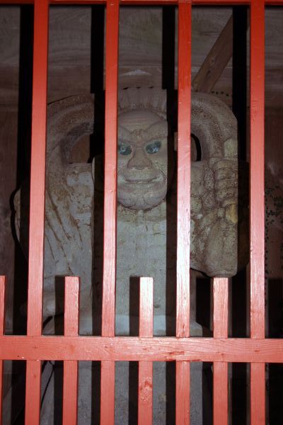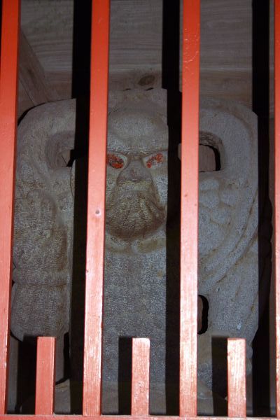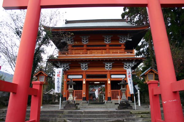 | 榎原神社楼門 県指定有形文化財 「この楼門は、1816(文化13)年に神社境内と門前町を結ぶ位置に建立された。 構造は、楼門づくりという木造二階建てで、高さ約11m、横幅約7m、奥行約4mで、一階の上に高欄の回廊を巡らせている。正面が三間からなり、中央が参詣者用の通用門(一戸、両側二間にそれぞれ仁王像を安置して、八本の柱脚で建っていることから三間一戸八脚門という。 楼門の特徴としては、柱上にだけ二手先出組を置き、二階の軒に隅木を配して垂木を並べ、その本数で柱間を決める和様式と、礎石と柱の間に礎盤を置き、柱上に台輪を置いてその上に組み物を置くことや、垂木を扇形に配するなどの禅宗様式と、流派的な折衷様式が用いられていることである。 このような建築様式は、古く神仏習合を物語る歴史上の貴重な文化遺産として、極めて価値の高いものである。 さらに、地場産の飫肥杉を柱等の材料とし、礎石や礎盤に榎原石と呼ばれる凝灰岩を加工して造る等、地方的特色が顕著であることからも、県下に類例のない古楼門である。」 宮崎県教育委員会 南郷町教育委員会 |