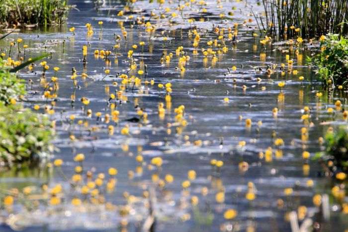 | 川坂地区の特徴 「一級河川北川の支流にある川坂地区は、周りを険しい山々に囲まれた低い土地で北川町の南東部に位置しています。 川坂湿地は、山ノ内谷川から川坂川の下流に広がり、川のほとりからの湧き水や谷からの水が流れ込んでいます。 ここには絶滅(その種が絶えること)しそうな動植物が多く生き残っています。環境省、宮崎県がまとめたレッドデ一夕ブックには18種載っています。また、6月頃から10月頃にかけて花が咲く、絶滅危惧(絶滅のおそれが一番高い)植物のオグラコウホネがたくさん育っているのは日本中でここだけです。」 |