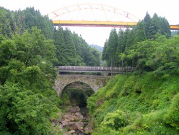 岩戸橋(大きい方) 大分県直入郡荻町柏原 橋長:28.2m 橋幅:4.4m 径間:17.4m 拱矢:8.9m 架橋:嘉永2年(1849) 岩戸水路橋(岩戸橋の下) 橋長: 橋幅:2.4m 径間:12.0m 架橋:大正末頃 荻町役場から県道695号線を南下、岩戸大橋を渡りすぐ右折。 坂道を道なりに下って行くと右手に架かっています。 |