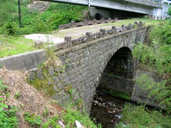 後山(うしろやま)橋 久住町白丹 後山 稲葉川 橋長:7.0m 橋幅:3.8m 径間:6.6m 拱矢:2.2m 架橋:大正末期頃 東稲葉橋より県道638号線へ戻り200mで県道131号線へ合流。 県道131号線を800m北上、新稲葉橋手前より市道へ右折、800m先後山八幡社の前に架かっています。 |