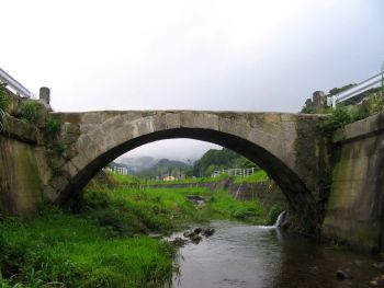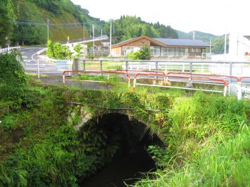 | 本名の太鼓橋 吉田町本名本吉田 橋長:6.0m 橋幅:3.8m 径間:5.2m 拱矢:3.8m 架設:大正2年 「テコ橋(太鼓橋) 橋の長さ 6m 橋のはば 3.78m アーチの直径 5.2m アーチの高さ 3.75m この橋は、大正の初めに、今まであった木の橋をこわして、二本松の石切場から運んできた石で造られたそうです。 本名校区でただ一つ、そのままの形で残っているいしばしです。 わたしたちは、みんなの力で昔からあるこの石橋を、大切に守っていきたいものです。 このほかに、本名校区に残っている石橋についても調べてみましょう。」 本名小学校文化財少年団 現在は使われておりません 後中橋から県道16号線を600m南進、現橋と平行に左手に架かっています。 |