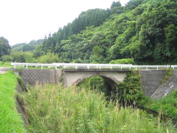 | 飯牟礼橋 東市来町高塚東 大里川 橋長:5.0m 橋幅:4.3m 径間:4.3m 拱矢:2.0m 架設:不明 井手之段橋から県道304号線へ戻り、2.9Km北上。 ショップタブチの先から右折、突き当りを左折、1.2Km先に架かっているが、上部からでは橋が架かっているようには見えない。 この橋を渡ったところから右に農道が分かれているので、目印に出来ます。 |