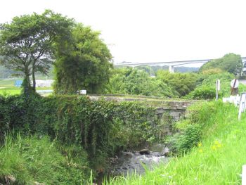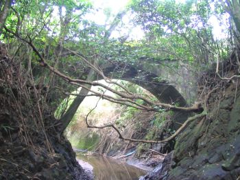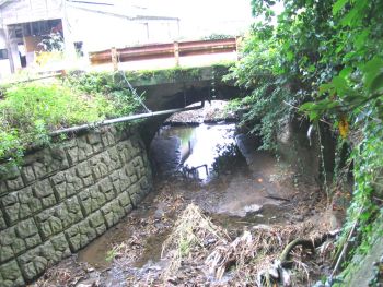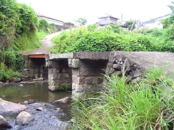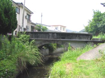 | 鈩口(たたらぐち)橋 東市来町鈩口 鈩口川 橋長:12.8m 橋幅:3.2m 径間:9.2m 拱矢:5.2m 架設:大正8年 汐見橋より国道270号線を1.5Km南下。 鈩口バス停手前より左折、すぐのところに架かっているが、上部からではよく分からない。 左岸上流側よりかろうじて降りることができた。 |