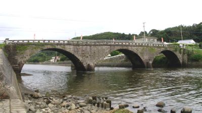 | 野元橋 日置郡東市来町上伊作田 江口川 橋長:12.5m 橋幅:3.9m 径間:12.5m 拱矢:3.7m 架設:明治 伊作田橋より県道303号線を200mくらい南下すると右下に見える。 |
