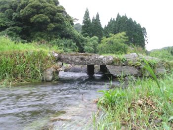 吹上町指定文化財 「この橋は初め永吉橋と呼ばれた二連の石橋で明治17年(1884)編集の鹿児島県地誌に「永吉橋村ノ西永吉ノ下流ニ架ス石造長十五間廣サ九尺伊作街道ニ属ス」とあり当時の礎石が今も水底に弧を描いている。 大正2年(1913)に長さ45.5m幅4.1m高さ6.5mの三連の石橋に改修されたのが現在の浜田橋である。橋材は近くの浜田石を小山田、加世田、永吉の石工と地元の人達が総掛りで切り出したものである。 以来昭和39年(1964)まで鉄道(1914〜1983)と共に薩摩半島の大動脈としての使命を果してきた。 平成3年にそれまでrたっか流失していた親柱、欄干の補修と橋面を舗装した装い新たな南薩摩路指折りの美しい三連の石橋である。」 吹上町教育委員会 |