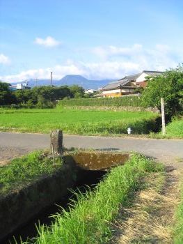 | 大平落(おでらおとし)中橋 えびの市大字原田字鬼塔 水路 橋長2.1m 橋幅4.4m 架設:明治初期 桁橋 ※後日再確認したところ、大平落中橋はここから約300m南、享保水路に架かっていました。 この橋は大平落の桁橋と呼ぶことにします。 今日の第一の目的はこの橋でした。 今年国登録有形文化財に指定されたというので、原田地区をあちこち探し回り、何人かの地元の方に尋ねましたが、どなたもご存知なかった。 大平落地区に架かる橋は数は少なく、この規模に該当する橋はこれだと思う。 国道221号線下五日市より県道407号線へ。 530m先左折すぐのところに架かっています。 |