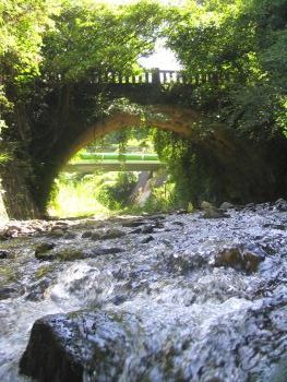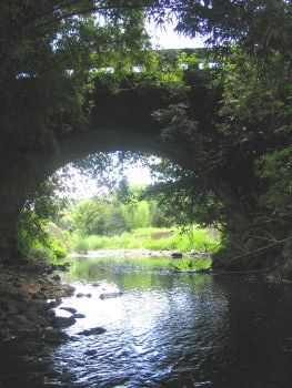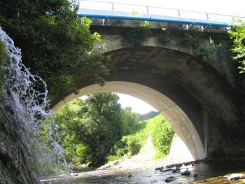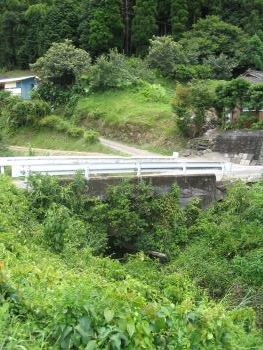 | 浅井野橋 宮之城町浅井野 泊野川 橋長:14.5m 橋幅:4.7m 径間:13.3m 拱矢:5.8m 架設:大正4年 平成16年3月、旧橋の下流側にアーチ型のコンクリート新橋が出来て、拡幅されました。 写真左手の白い糸みたいなものは滝の水しぶきです。 一ツ木三文字から国道504号線を北西へ800m。 左手に架かっています。 |