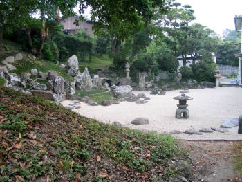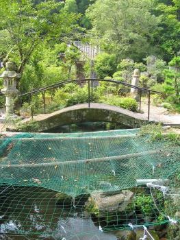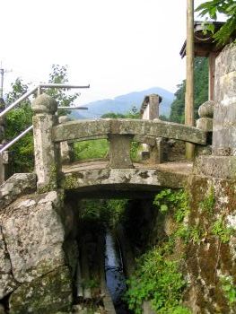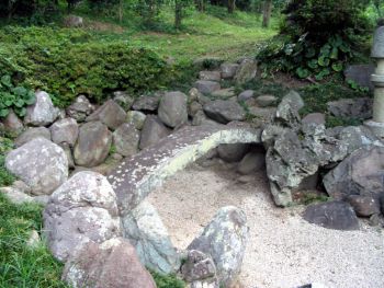 | 妙経寺庭園橋 杵築市南杵築 橋長:2.9m 橋幅:0.4m 架設:安永4年(1775) 単径間せり持式桁橋 国道213号線、杵築市内で錦港橋を渡り150m先左折、50m先右折、左手に見えるのが妙経寺。 寺町の西側にあたります。 |