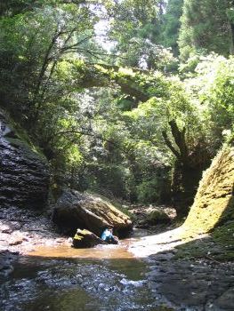 超難関ですが、絶対に探し出す気持ちで挑みました。 地元の方に聞きましたが、知らないとおっしゃるので、川へ降りる道だけ教えて頂きました。 おおまかな位置は分かるのですが、さてどうやって行ったらいいのかが問題です。 多分谷を渡っているはずですので、地形から見当をつけ川へ降りたのですが、対岸はすごい藪で、突っ切るのは不可能です。左岸側を一旦下流へ歩き、対岸へ渡り藪の切れ目から山へ登りましたが、一面すごい藪です。 最初の谷を少し登りましたがどうもありそうではありません。 引き返そうかとも思いましたが、どうしてもあるはずですので、あきらめきれず、右岸沿いに上流へ向いようやく2番目の谷にたどり着きました。 その谷を少し登ると頭上にその雄姿が現れました。 |