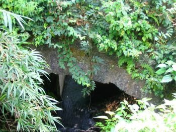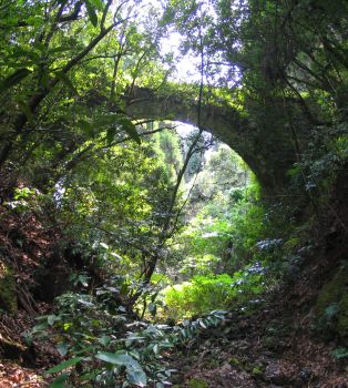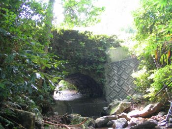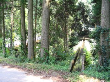 明正井路2幹5号橋 緒方町上冬原 橋長:13.5m 橋幅:2.7m 径間:2.6m 拱矢:1.1m 架設:大正12年(1923) さて、ここが問題でした。6号橋は県道東側にありました。5号橋は絶対に県道の西側にあるはずです。 ところが、水路は県道からトンネルになり西へ伸びています。 山道を進み、栗林の中を水路をたどって歩きましたがどうしても見つからず、一旦県道へ引き返し、県道付近を探しましたが、ありません。 再び山道へ引き返し、水路をたどって歩き、見当をつけた場所へ車で進みようやくたどり着きました。 明正井路2幹が県道をくぐるところから50m南を右折。 50m先の分岐は真ん中の道へ(右は民家への玄関道です)。150m先栗林の右下へ。 150m先に車を止め、50m左手に架かっています。 |