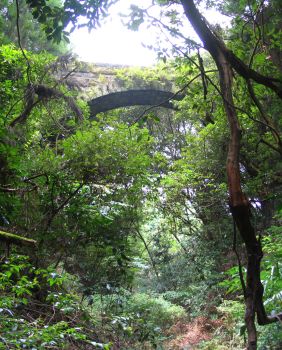 | 明正井路合川補水2号橋 緒方町平石 橋長:40.0m 橋幅:1.1m 径間:30.0m 拱矢: 架設:昭和18年(1943) 明正井路合川補水1号橋から市道へ戻り、200m東進。 右手ガードレールの切れ目のところの対岸の谷に架かっています。 その谷へは直接川を渡って行けませんので、一旦下流へ下り、山へ登り川沿いに西方向へ進み二つ目の谷のやや上流です。 |