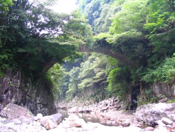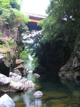 権現橋 緒方町上畑 九折 奥嶽川 橋長:22.5m 橋幅:4.5m 径間: 拱矢: 架設:昭和16年(1941) 下流側は深い谷で、どうやっても降りることはできません。 左岸上流側へ200mくらい進み、川へ降り、そこから下流へ歩いてこの場所へ出ます。 手前は現橋です。 犬返橋から県道7号線へ戻り、4.8Km南下。 九折方面へ左折、1.3Km先現橋の左手に架かっています。 |