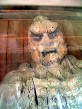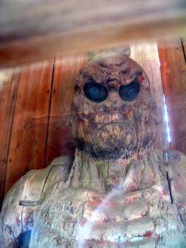南光寺の仁王 県指定重要文化財 「木造金剛力士像(二躯) 仁王は寺の山門にあって、方域を守護する金剛力の力士です。 密迹金剛(口を開いている方) 高さ 2.275m 胸囲 1.550m 那羅延金剛(口を閉じている方) 高さ 2.200m 胸囲 1.550m 樟の寄木造。仁聞作といわれる男性美に満ちた鎌倉期彫刻の特色を表わしている。(一部は後世補修)」 安心院町教育委員会 |