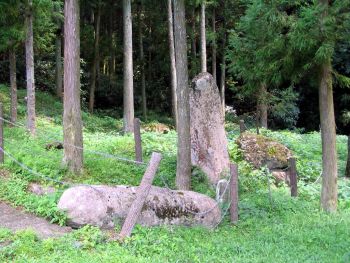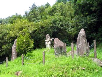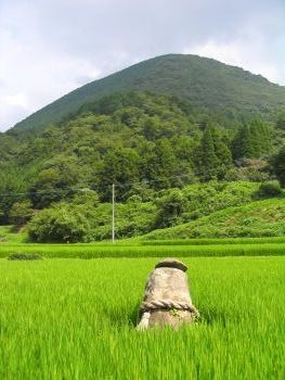| 佐田京石(さだきょういし) 「太古の祭祀場か?鳥居の原形か?埋納経の標石か?定説は未だありません。 通路を登って左側の柵内は、マウンド中央の石柱から半円形を描くように石柱が配された環状列石と推測されます。 また、右側の昨内にはドルメン(支石墓)と思われる巨石があります。石柱の表面にはペトログラフ(岩刻文字)の存在が指摘されています。背後にある山は、米神山(標高475m)と呼ばれ、山頂部にも環状列石(高さ50cm程度の石)があります。また、ここから宇佐方面へ行った地点右側の水田中に、米神山側に先端が向いた立石があり、その上に小さな扁平石を載せたものが立っています。地元ではこしき石と呼ばれ、蓋石を取り除くと暴風になると伝え暴風石とも呼ばれています。 この様に山の名やこしき石等、米に係る名が多く有りますので弥生時代頃のものとも思われますが、定かではありません。」 安心院町教育委員会 |