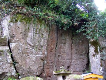 下市(しもいち)磨崖仏 県指定史跡 「北東斜面については、南北朝期を遡らない14世紀後半頃の造顕、 南東壁については、鎌倉時代も13世紀頃の造立とみられる。 以上のように、下市磨崖仏は二期に分かれて造立されたと考えられている。また、同磨崖仏の造顕には、この地の地頭新聞氏あるいは領家であった宇佐宮が関わった可能性がある。」 安心院町教育委員会 |