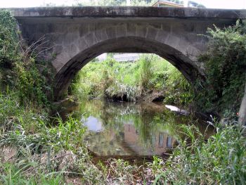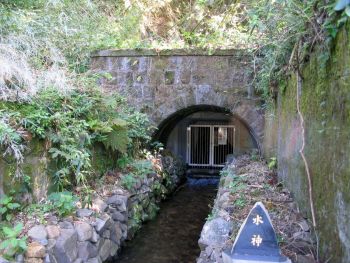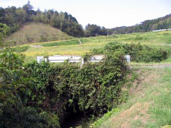 六番谷橋 串木野市大字下名六番口 金山川 橋長:5.0m 橋幅:3.2m 径間:2.9m 拱矢:1.4m ゴールドパーク入口から国道3号線を100m北上。山本商店から右折、突き当たりのポンプ室の裏にあります。 旧三井鉱山六番口入口跡だそうです。 |