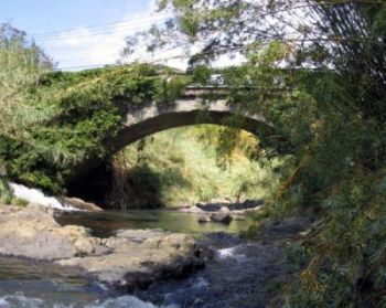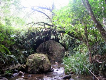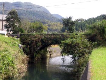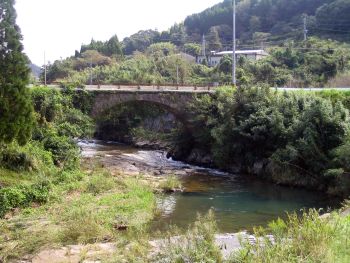 | 八牟礼(はちむれ)橋 串木野市冠岳 五反田川 橋長:16.5m 橋幅:3.8m 径間:14.3m 拱矢:4.5m 架設:大正7年 岩下橋から県道39号線を1.8Km西進、冠岳郵便局先を鋭角に右折、下ったところに架かっています。 |