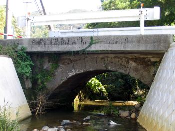 | 焼山(やきやま)橋 串木野市大字下名 オコン川 橋長:6.4m 橋幅:3.5m 径間:5.0m 拱矢:5.1m 国道3号線を北上、ゴールドパーク入口を左折。2.1Km先右手坂道を登り、250m先に架かっています。 |