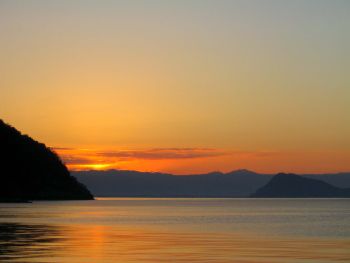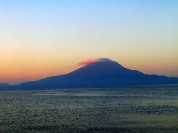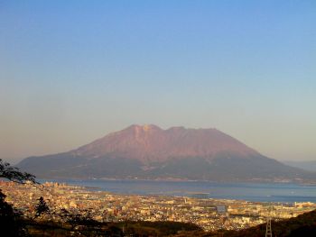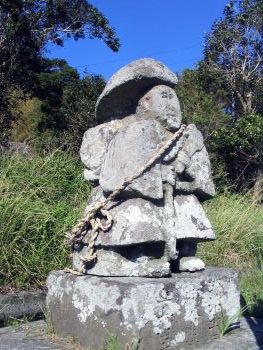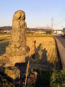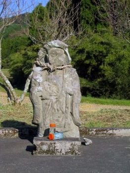 滝の下の田の神 鹿児島市 遠く桜島が見えます |