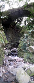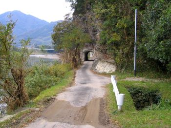 岩をくりぬいた随道が見えます。ここに来るまでに2〜3箇所このような随道がありました。 ガードレールの右下にあります。 国道387号線、宇佐インター入口から県道625号線へ、駅館川を渡り2つ目の信号(押しボタン式)を左折、駅館川沿いに900m南下したところに架かっています。 |