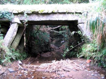 この谷川が宇佐市と院内町の境界みたいです。 広瀬井路段垂水路橋から国道387号線に戻り、1.8Km南下。宇佐開発株式会社入口看板から右折、左手に日大化成を見て400m先谷川沿いに150mほど下ると左手に架かっています。 |