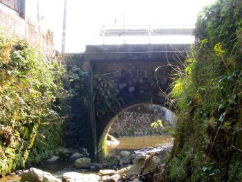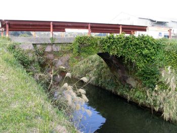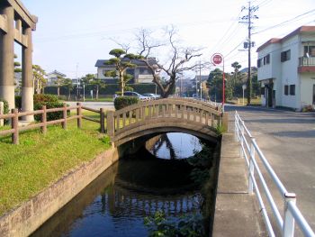 下を覗き込むと石造アーチ橋でした。 国道270号線、加世田市役所前から950m南下、左手駐車場脇用水路に架かっています。 |