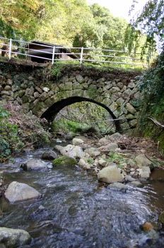 小谷にはこの他2基の石橋があったそうですが、河川工事で撤去されたそうです。 県道30号線、西正寺派出所のすぐ西側に酒屋さんがあります。そこから町道へ進みます。900m先折木方面標識に従って右折、100m先広い道路へ左折。 1.7Km先、折木・諏訪の池方面へ右折、100m先右手に諏訪の池方面の標識がありますので、そこから小道を徒歩で200mくらい上がったところに架かっています。 |