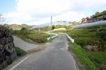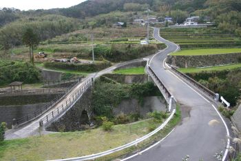 北有馬町役場から県道30号線を600m西進、県道217号線へ右折。1.2Km先右手案内板より下ったところ。 「北有馬町には島原半島のアーチ式石橋の大半が集中しており、全32基の内、12基が北有馬町に現存している。中でも面無橋はアーチ式石橋の技術面から見ると、特異な石橋である。 アーチ式石橋は全部の石が密着して少しもぐらつかないように頑丈に組まないと、車の振動や地震で崩れるため、自然石をアーチに使用しないのが通常である。わが国最高の技術を持った熊本の岩永三五郎のアーチ式石橋は全て切石で締め、自然石は崩れても修理しやすいため壁石にだけ使った工法を採用している。このような自然石のみを使った工法を使いこなし、130年以上も崩れない自然石積みの技術は、土木技術上極めて貴重である。さらに大雨で石橋が流されないように、石橋すぐ下の川床を60センチほど掘り下げ、流速を速めている。堰き止めた水の流速を増すための堰落とし(せきおとし)が、洪水から面無橋を守ってきたのである。 自然石をアーチに使った石橋は長崎市内にも4基あったが、昭和57年の長崎大水害で4基ともながれたため、日本国内に残る自然石のアーチ式石橋は、面無橋ただ1つとなった。 長さ12.0m 径間4.7m 橋幅3.4m 構築年代江戸末期」 北有馬町 |