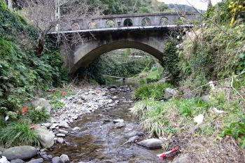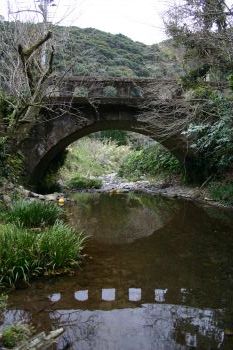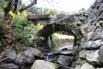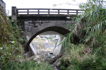 川内市・阿久根市境から国道3号線を4.8Km北上。長迫入口から右折、1.1Km先跨道橋を過ぎたところ、カーブミラーから左下へ。途中JR鹿児島本線の下を通り1.2Km先突き当たり、新中津川橋のすぐ上流に架かっています。 「正確な架橋の年代は不明であるが、昭和の初期の頃のものと思われ、岩盤を基礎にした、凝灰岩によるアーチ橋である。 現在阿久根市にある6つの石橋の一つで(平成12年四月1日現在)、貴重なものである。平成12年新中津川橋の架橋と同時に取り壊す予定であったが、石橋保存のため、計画を変更し、残すこととなったものである。」 阿久根市教育委員会 |