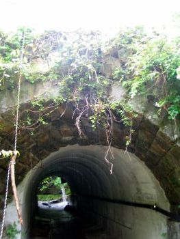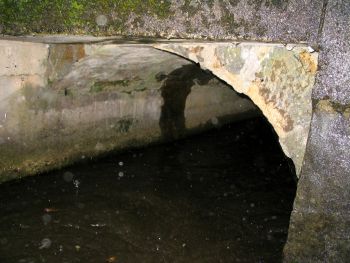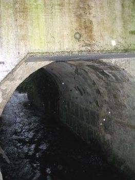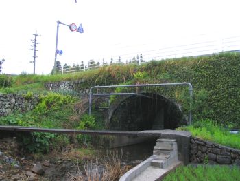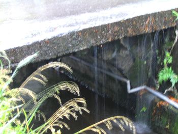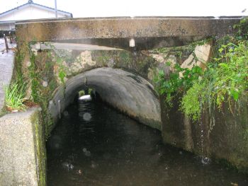 | 落鹿(おとし)1号橋(仮称) 日向市美々津 落鹿 水路 橋長:2.2m 橋幅:計測できず 径間:1.8m 拱矢:0.6m |