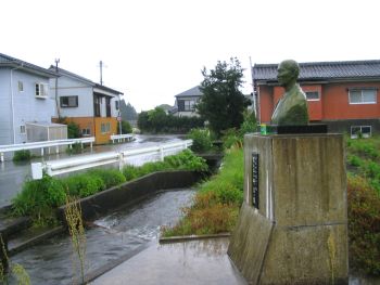 水路の上流側には、「百町原開田の祖 荻原俵三郎翁」像が建っています。 お蔭で、ここが百町原であることが判り、石橋が架かっているのはこの水路だと確信しました。 |