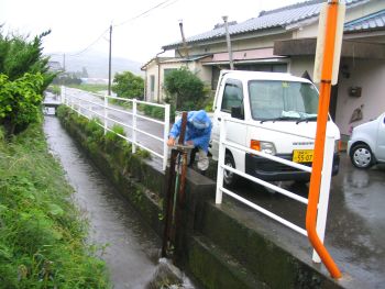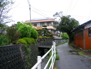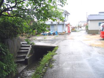 どしゃぶりの雨の中、早朝6時半前水路の水量調節に来られた方に尋ねました。 ちょうどここの下流から消防小屋までの区間に石橋が架かっているそうです。 道路の反対側には公民館があり「落鹿」(おとし)地区だそうです。 |