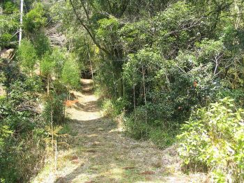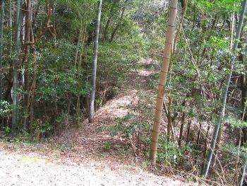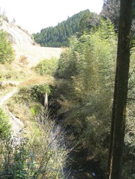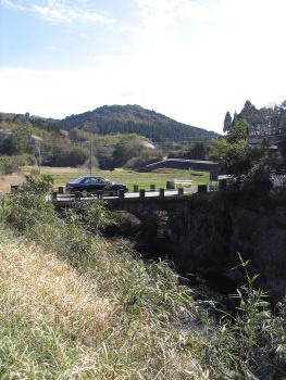 県道2号線を財部町と霧島町境から西へ1.8Km、ちょっと分かりづらいですので、その先にある田代ハウジングより900m東の地点から北へ伸びる市野々へ。 細い山道を800m進むとこの橋です。途中日豊本線の踏切を渡ります。 |