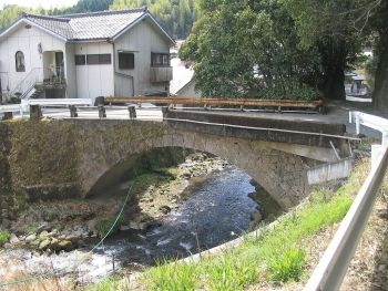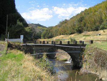 | 上中津川橋 牧園町宿窪田 小谷川 橋長:12.1m 橋幅:3.9m 径間:10.0m 拱矢:3.0m 架橋:明治32年 |