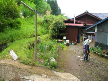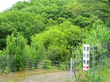 | 二度目の標柱の左手に宇田枝井路3号橋、右手に深谷橋があります。 | この方の家の左手に水路が流れており、左後方に宇田枝井路3号橋が架かっています。 イノシシ防止柵を建ててから、石橋を見に来る人の数が減ったそうです。 |