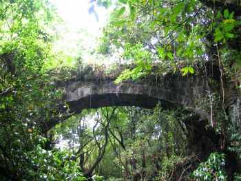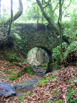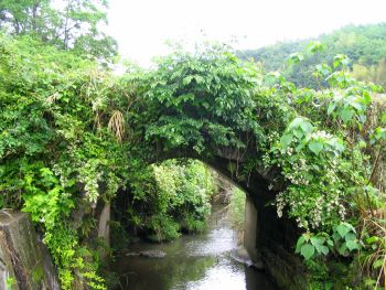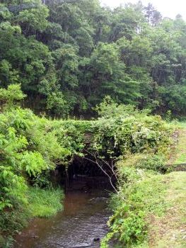 | 万地橋(仮称) 北川町 橋長: 橋幅:8.4m 径間:5.4m 拱矢:2.3m 岡崎文雄様のコメントです「壁石は、いつも草が茂っているようでくわしくは分かりませんが、アーチ石の周りを幾重にも巻いており、宮崎県内ではこの橋だけの特徴と思います。」 |