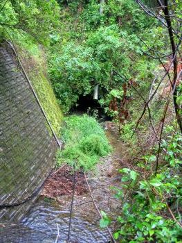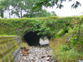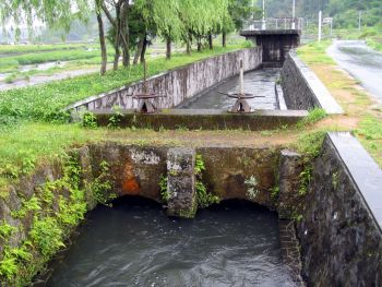 緒方下井路取水口橋 緒方町辻 橋長:2.9m 橋幅:0.6m 径間:1.2m 拱矢:0.3m 原尻の滝の横、水門。 |