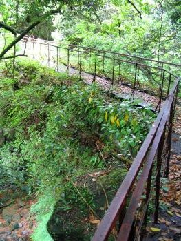 | 宇田枝井路1号橋 清川村左右知 橋長:22.0m 橋幅:2.3m 架設:不明 上部は鉄板が敷いてあり、手摺りもついているので安全に歩いて渡れるが、谷が深くてどうしても下には降りることができませんでした。 写真もこれが精一杯です。 感覚的には野津町の間戸川車橋みたいな立地条件です 轟橋から南へ300m、カーブミラーの前の小道を左下に下るとこの橋が架かっています。 |