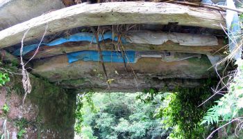 上部はコンクリートで拡幅してあります。 3本の桁は確認できますが、あと2本は崩壊したのでしょうか、木材とコンクリートで補強してあります。 |